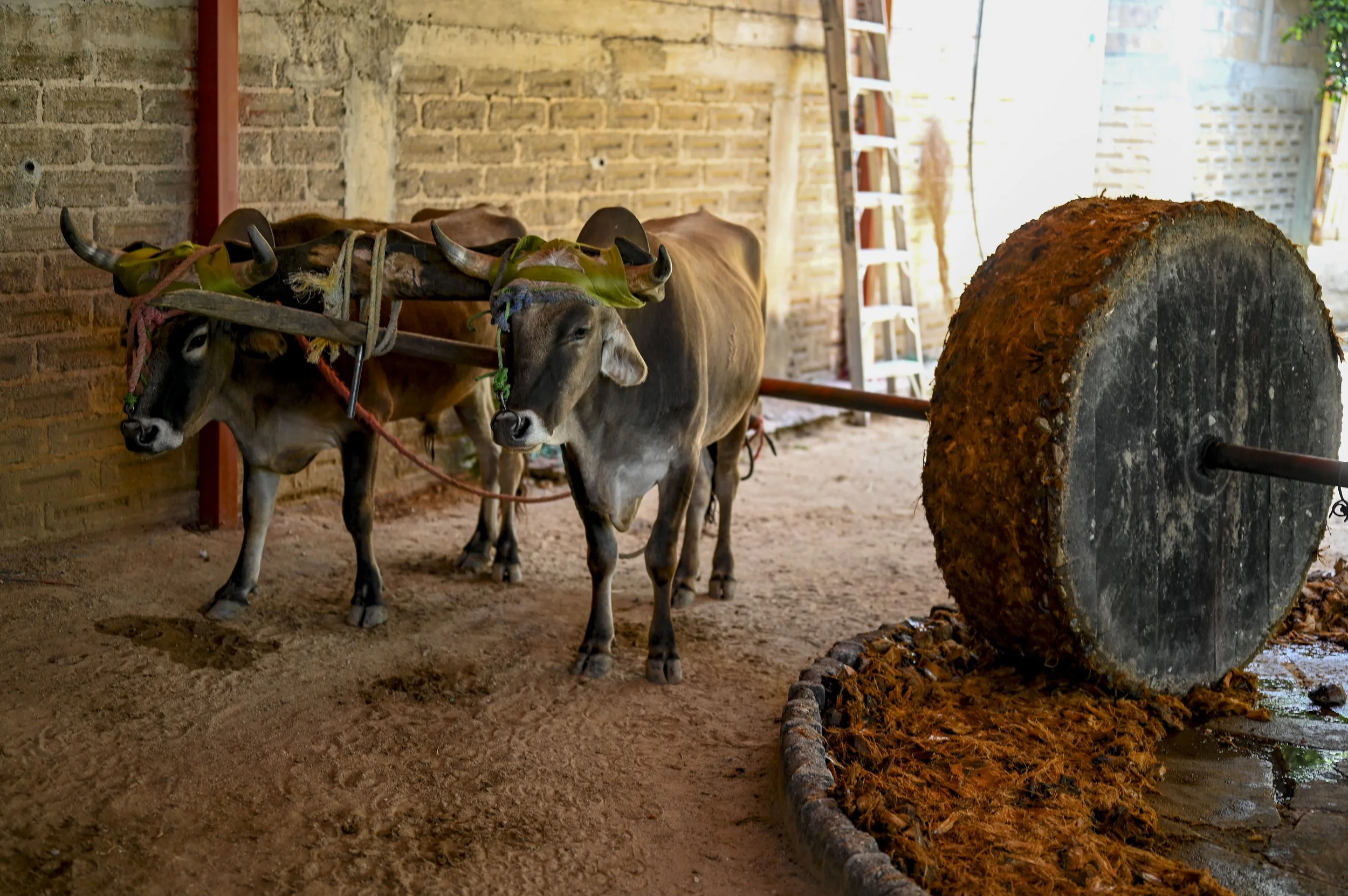 Tamarindo and Melón, our oxen, pull the massive stone tahona to crush the roasted agave.